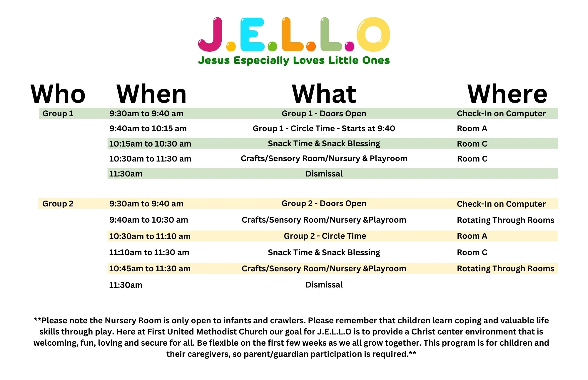 Whether you attend Tuesday or Thursdays, we will have two Circle Time Groups. If you have multiple children attending, both will be in the older child’s age group already assigned. We ask that you attend the circle time that has been assigned. We want to ensure the safety of all J.E.L.L.O. children.